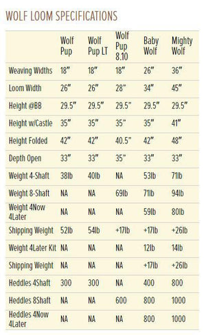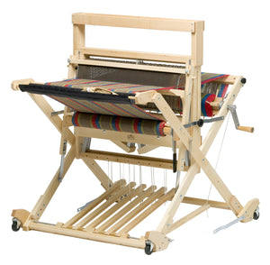 The weaving width of the Baby Wolf is 26″. You have your choice of four or eight shafts, or you can choose our Four Now-Four Later* model which allows you to expand from four shafts to eight shafts at any time. The X-frame design is exceptionally stable and can be easily folded to a depth of 18″.