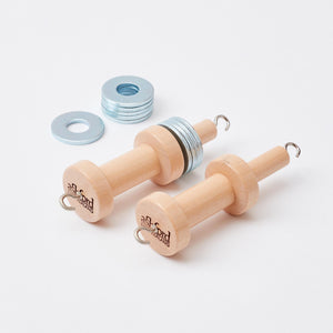 Use these handy warp thread weights to hold floating selvedges, supplementary or broken warp threads under tension while you weave. Designed to hold long lengths of warp thread around the central spool. Includes hooks on both ends and multiple steel weights to vary the tension on your yarn. Smooth lacquer finish. Pack of 2.