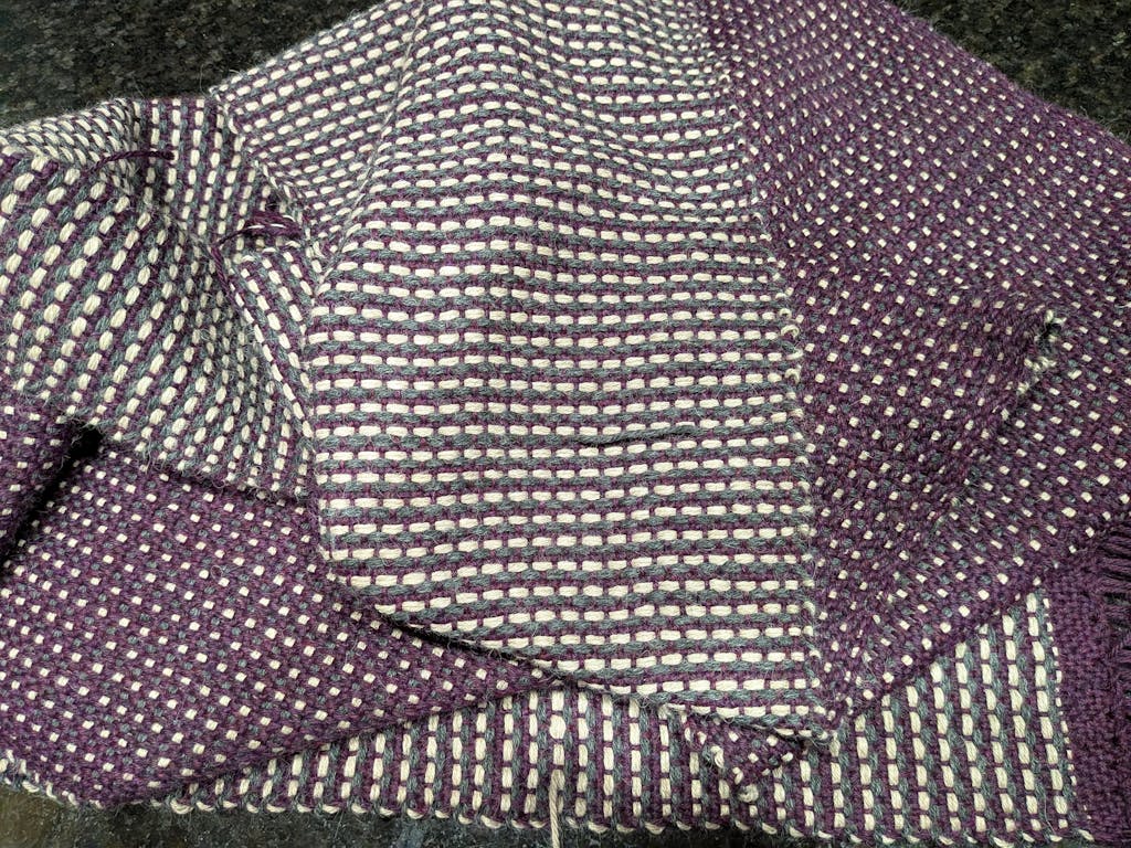 I love working with Ode. It is a wonderful fiber to weave and wear. I hand wash then either drape over several lines or throw it in the dryer to dry. Air drying provides a finish that is close to the original weave. Machine drying gives a fluffier finish. I gave my youngest child and her family Ode scarves for Christmas. They thought that I purchased them. When I explained that they were handmade, they were highly impressed. The finished produce always looks polished and classy. I highly recommend this for weavers of any skill level. Beginners need to keep in mind that twills drape softer and freer than plain weave, but both are nice. This is a picture of one of the scarves before I wet finished it. I air dried it and it looks the same now that it is finished.