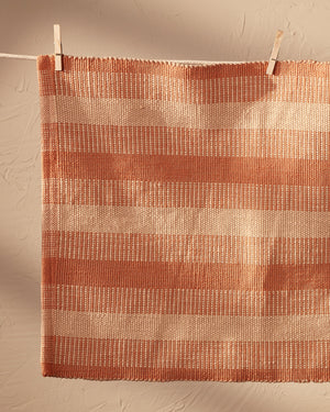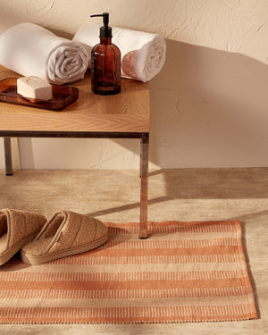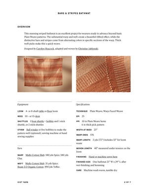 This stunning striped bathmat is an excellent project for weavers ready to advance beyond basic Plain Weave patterns. The substantial warp and weft create a beautiful ribbed effect, while the distinctive bars and stripes come from alternating colors in specific sections of the warp. Thick weft picks make this a quick weave. Order a kit.