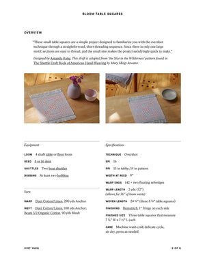 Designed by Amanda RatajThese small table squares are a simple project designed to familiarize you with the Overshot technique through a straightforward, short threading sequence. Since there is only one large motif, sections are easy to thread, and the small size makes the project satisfyingly quick to make. Order a kit.