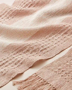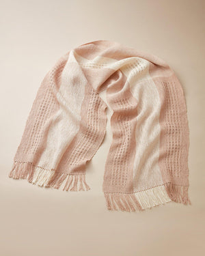 This lightweight cotton and linen scarf is woven in plain weave with hand-manipulated lace details.