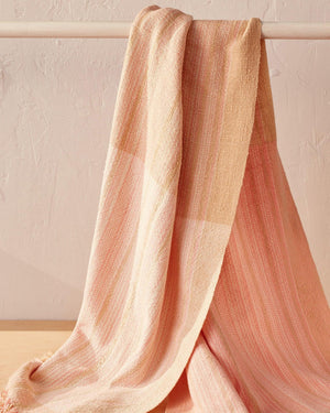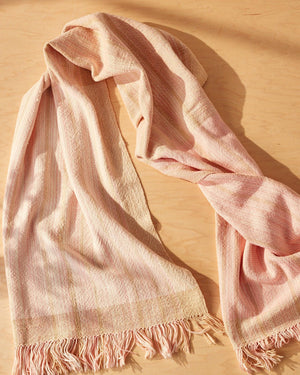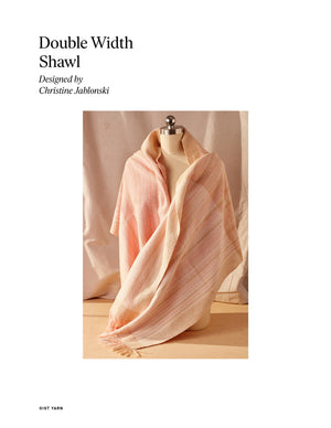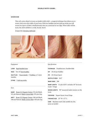 This soft cotton shawl is woven as Doublewidth cloth—a magical technique that allows you to weave cloth twice the width of your loom. With two heddles and two pick-up sticks you will weave two layers of fabric simultaneously, that are connected at one edge. When taken off the loom, the cloth unfolds to a wide, beachy shawl. Order a kit.
