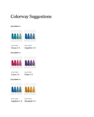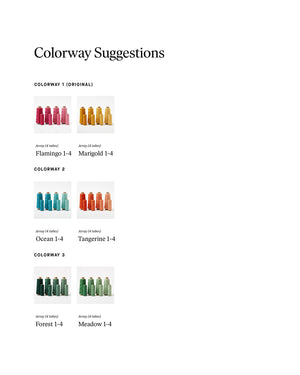 Warp: Array Wool, 45 yds each of Flamingo 1-4 and Marigold 1-4.