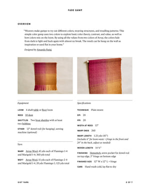 Weavers make gamps to try out different colors, weaving structures, and treadling patterns. This simple color gamp uses two colors to explore basic color theory, contrast, and value, as well as how colors mix on the loom. By using all the values from two colors of Array, the colors fade from dark to light and back again with almost no break. The result can be hung on the wall as inspiration or used flat in your home. Order a kit.