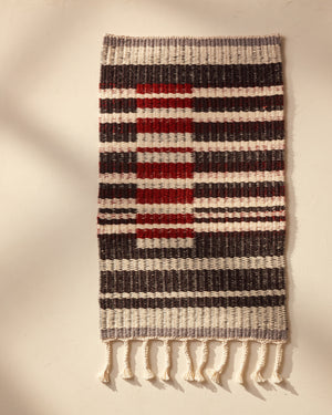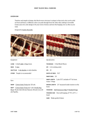 Timeless and simple in design, this block weave structure is unique in that each color can be solid on front and back, or different colors can peek through from the other side, making it reversible. Create your own color design to fit your room of choice and turn the hanging over as often as you wish. Order a kit.