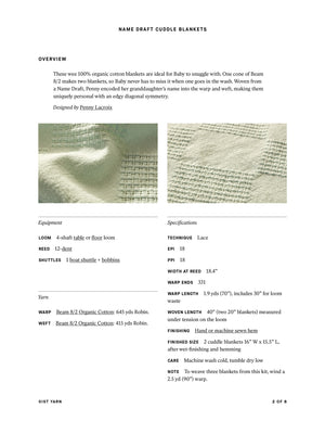 These 100% organic cotton blankets are perfect for little ones to snuggle with. One cone of Beam 8/2 makes two blankets, ensuring there's always a spare when one goes in the wash. Woven from a Name Draft, Penny encoded her granddaughter’s name into the warp and weft, making them uniquely personal with an edgy diagonal symmetry. Order a kit.