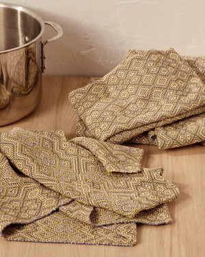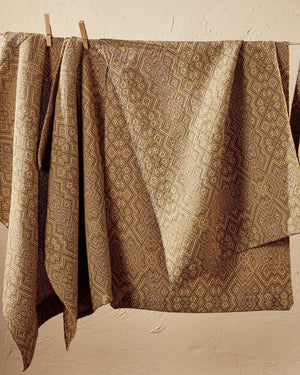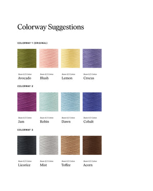 This project explores what happens Shadow Weave loses its traditional dark warp and weft float interlacement, which produces the distinctive diagonal lines in an overall design. When dark and light floats interlock, the heavy shadow lines disappear and the pattern shifts “out of phase,” changing the prominent design feature from outline to optical blending. These shifts happen at transition points in the threading and treadling, without having to reverse the warp or weft dark/light sequencing. Order a kit.