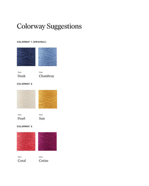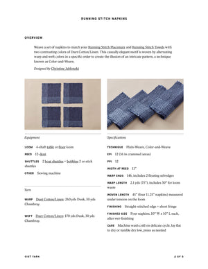 Pattern downloads include files for both rigid heddle and shaft loom weaving. Yardage requirements vary based upon loom waste. Order a kit.