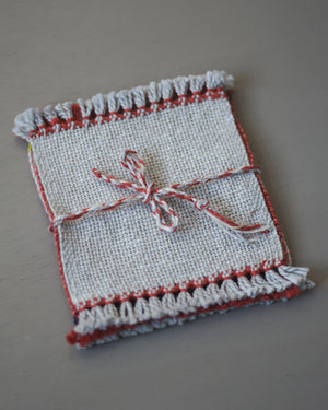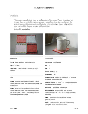 Coasters are an excellent way to use up small amounts of leftover yarn. They’re so quick and easy to make that even an absolute beginner can make a successful set in an afternoon. Because this project requires so little material, it’s ideal for testing color, various types of yarn, and practicing your weaving skills, like clean selvedges and hemstitching.