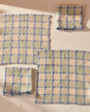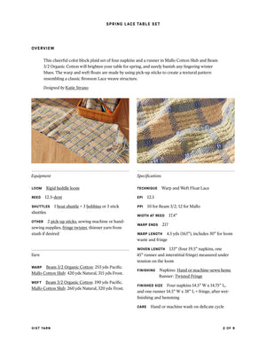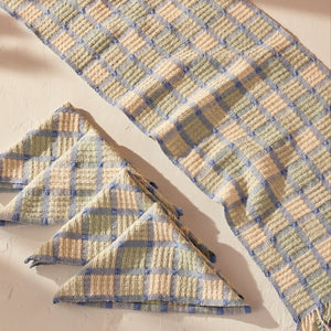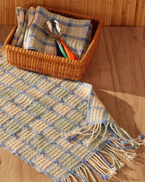 This cheerful color block plaid set of four napkins and a runner, or placemats, in Mallo Cotton Slub and Beam 3/2 Organic Cotton will brighten your table for spring, and surely banish any lingering winter blues. The warp and weft floats are made by using pick-up sticks to create a textural pattern resembling a classic Bronson Lace weave structure.