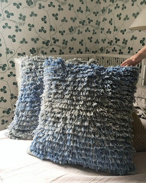 A set of Rya pillows woven in the Scandinavian way, making rows of knots on a Plain Weave base. Order a kit.