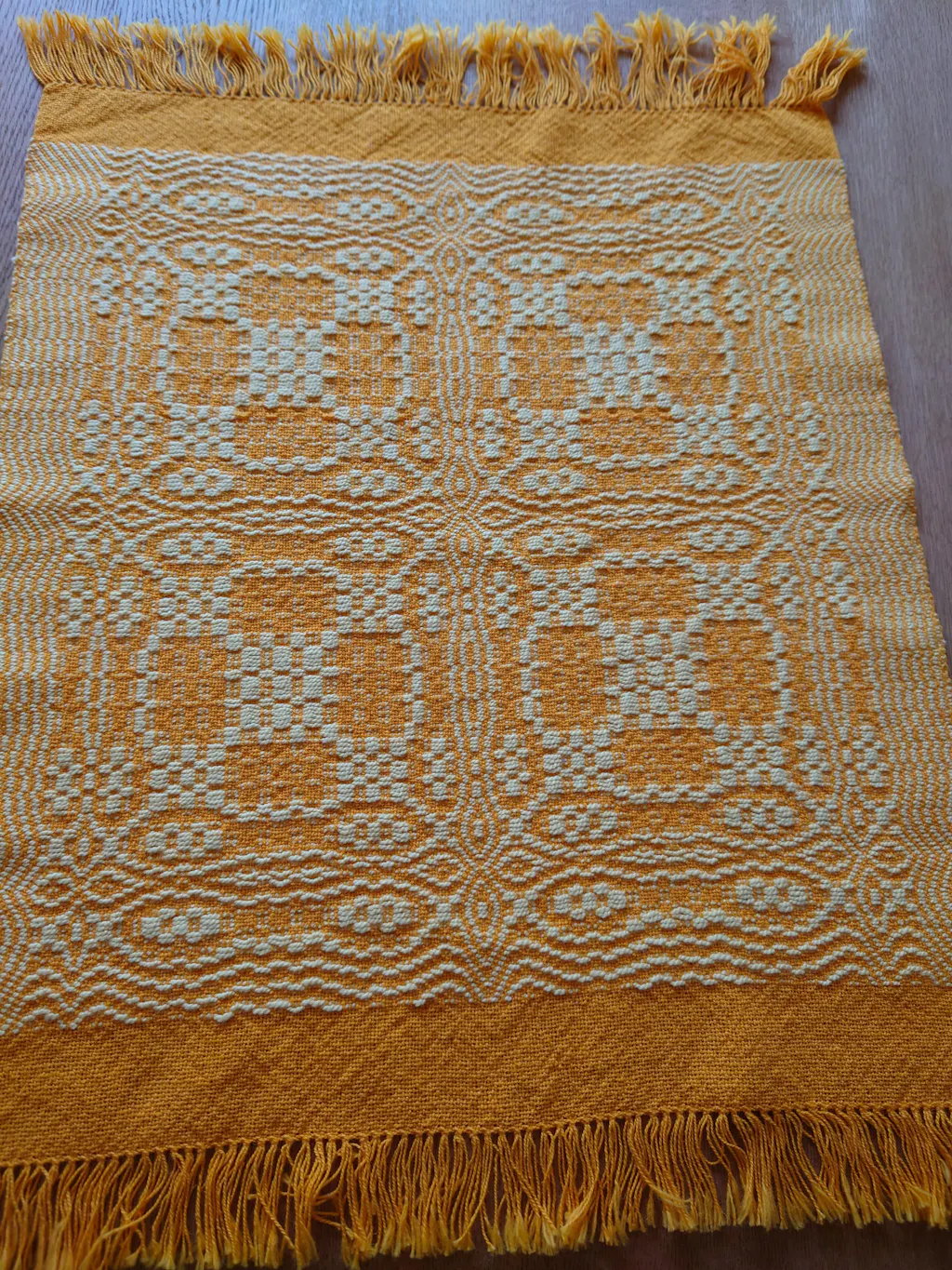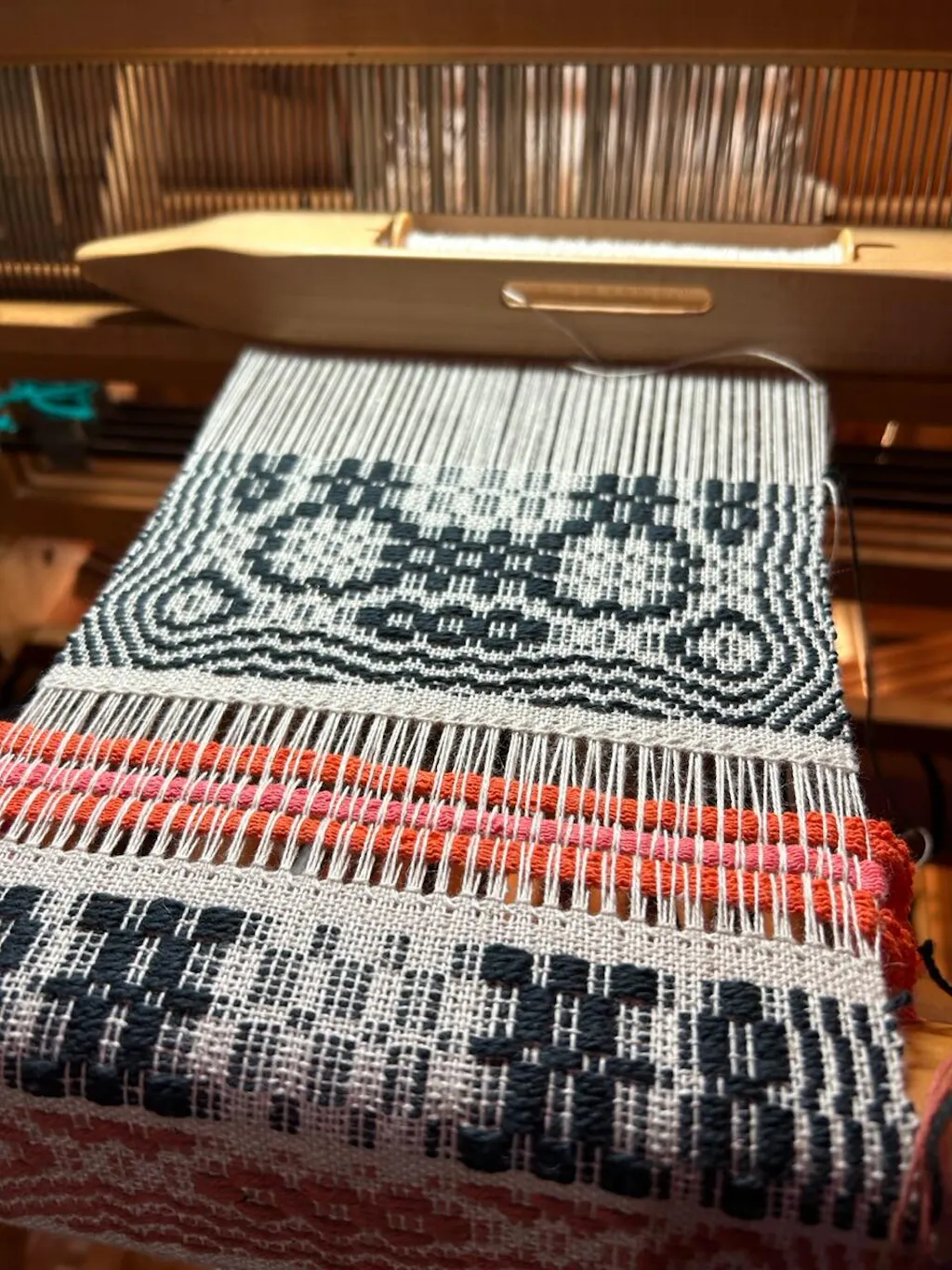 I am using the pattern as a starting point to make a wider and longer table runner. It's coming out really well! Thank you for such clear instructions, a draft that is easy to read and use, and a beautiful pattern! For my piece, I am using 8/2 cottolin for the warp and tabby weft and 8/4 cotton for the pattern weft, sett at 20 epi. The photo is my table runner on the loom.