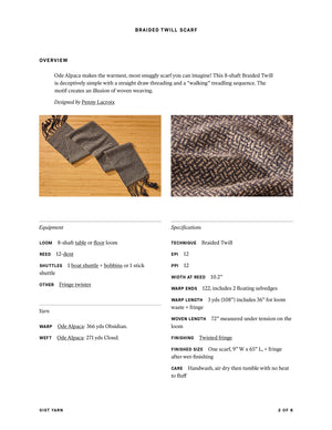 Ode Alpaca makes the warmest, most snuggly scarf you can imagine! This 8-shaft Braided Twill is deceptively simple with a straight draw threading and a “walking” treadling sequence. The motif creates an illusion of woven weaving. Order a kit.