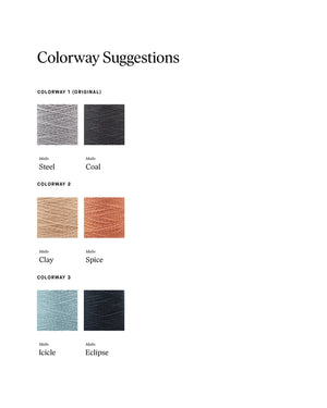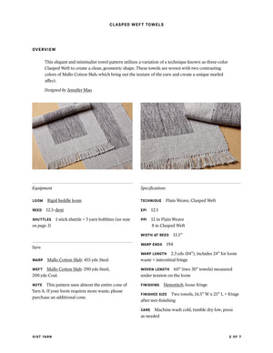This elegant and minimalist towel pattern utilizes a variation of a technique known as three-color Clasped Weft to create a clean, geometric shape. These towels are woven with two contrasting colors, which highlight the texture of the Mallo Cotton Slub and create a unique marled affect. Order a kit.