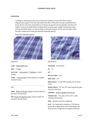 Tracking is the name for diagonal lines that appear in cloth after wet finishing. This pattern uses Pick-up Stick Floats to set the tracking in a diamond pattern. On the loom, the fabric is flat, but after washing in hot water, the diamonds magically appear. Order a kit.