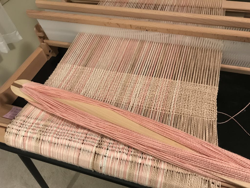 Unfortunately, I learned the hard way, after hours of warping, that this does not work well with a Cricket Rigid Heddle Loom. There are no places for the necessary two heddles. There is a way to work around this, but I didn’t find it satisfactory. The instructions are quite confusing, as well. I found a couple of YouTube videos that were extremely helpful, one of which explained why I wasn’t able to use the Cricket Loom for this.