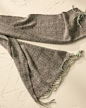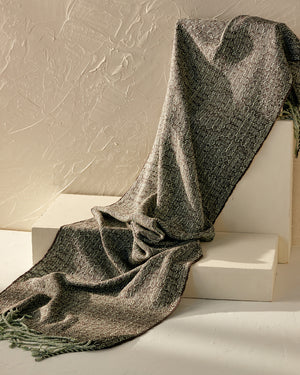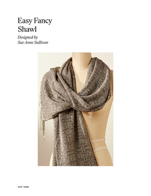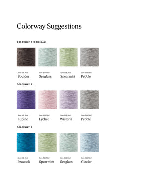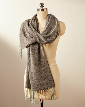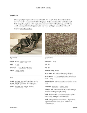 This elegant, lightweight shawl is woven in Sero Silk Noil on eight shafts. Three light shades in the warp provide a background of subtle color play as the darker weft sketches out the balanced twill design. Holding three colors together makes short work of winding the warp, and with one shuttle and a repetitive treadling pattern, this easy weave quickly produces a fancy silk shawl. Order a kit.