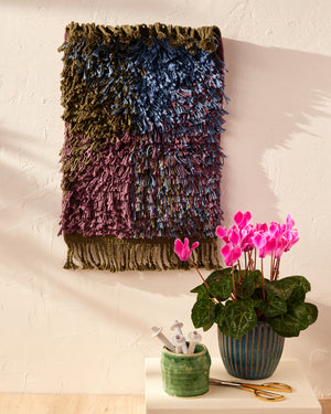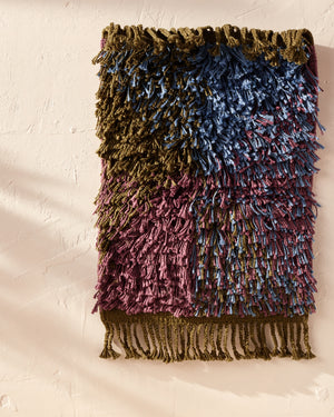 In 2024, North America experienced a total eclipse, an astrological event that brought ethereal wonder to many of our lives. This rug-style Rya takes inspiration from the event, combining darker valued colors in a cascading dusky spiral. This small project is an excellent place to learn about rug-style Ryas, or creating a strong sturdy textile with a thicker pile. Due to the limited yardage requirements for the Rya knots, this makes an excellent stash buster project. Order a kit.