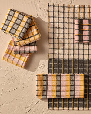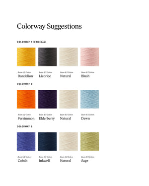 Weft: Beam 8/2 Organic Cotton, 173 yds Natural, 992 yds Licorice, 795 yds Dandelion, 655 yds Blush.