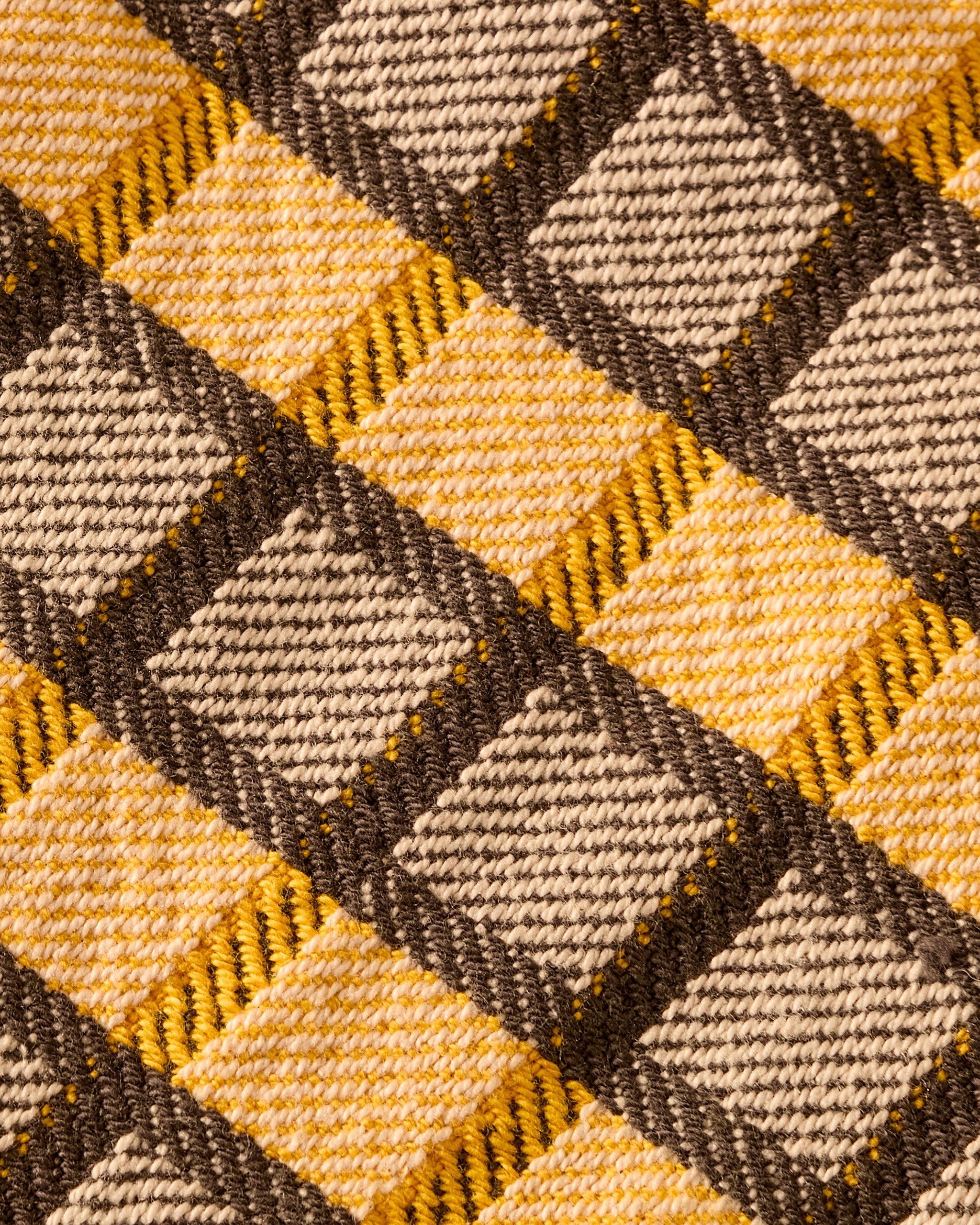 Warp: Beam 8/2 Organic Cotton, 2,013 yds Natural, 577 yds Licorice, 197 yds Dandelion.