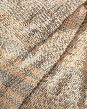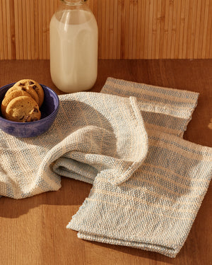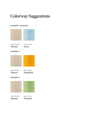 Using just one cone each of Mallo Cotton Slub and Beam 3/2 Organic Cotton, these soft, pillowy towels are woven with an extremely open weft sett, creating the texture and drape of a well-loved vintage linen. The warp-predominant structure “fades” the weft color, giving the cloth a distinctly antiqued look. Create your own weft stripe design to give your towels a personalized, idiosyncratic pattern of color and texture, or weave as shown. Order a kit.