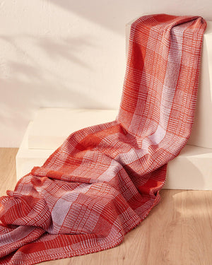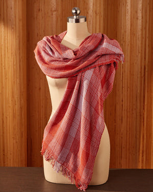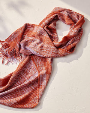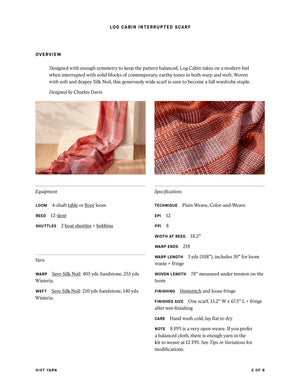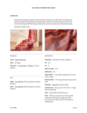 Designed with enough symmetry to keep the pattern balanced, Log Cabin takes on a very modern feel when interrupted with solid blocks of contemporary, earthy tones in both warp and weft. Woven with soft and drapey Silk Noil, this generously wide scarf is sure to become a fall wardrobe staple.
