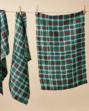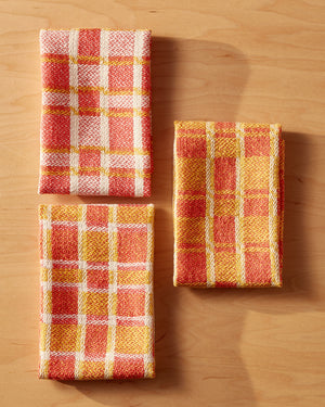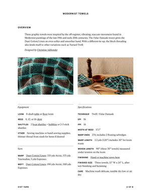 These graphic towels were inspired by the off-register, vibrating, staccato movement found in Modernist paintings of the late 19th and early 20th centuries. The False Damask weave gives the Duet Cotton/Linen an even softer and smoother hand. With a different tie-up, the block threading also lends itself to other variations such as Turned Twill. Order a kit.