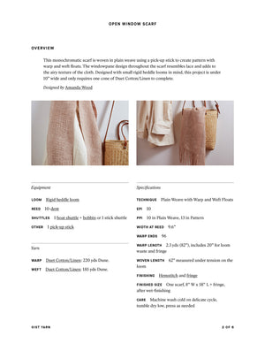 Designed by Amanda WoodThis monochromatic scarf is woven in plain weave using a pick-up stick to create pattern with warp and weft floats. The Windowpane design throughout the scarf resembles lace and adds to the airy texture of the cloth. Designed with small rigid heddle looms in mind, this project is under 10” wide and only requires one cone of Duet Cotton/Linen to complete. Order a kit.