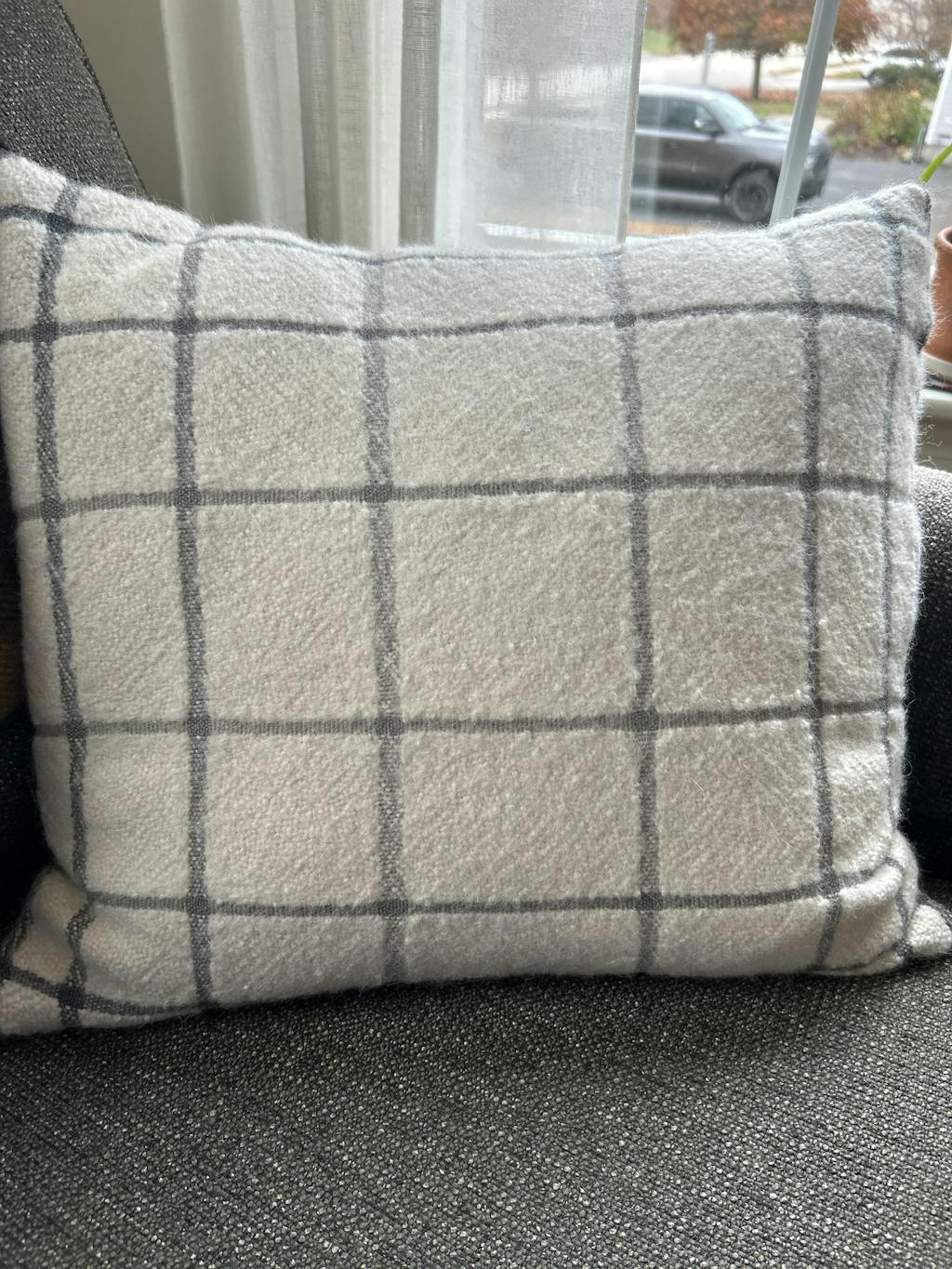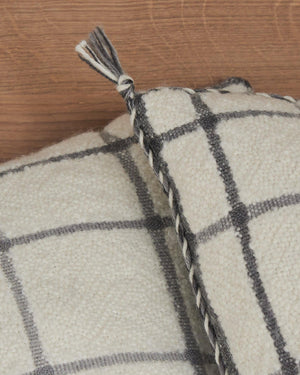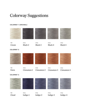 These fleecy textured pillows are woven with a combination of Ode and Array, bringing out the unique qualities of each. When the fabric is washed after weaving, the wool yarn will full (shrink slightly), highlighting the extra plush hand of the alpaca. Four shades of Array are used throughout the design to add a soft dimensional effect.