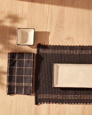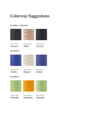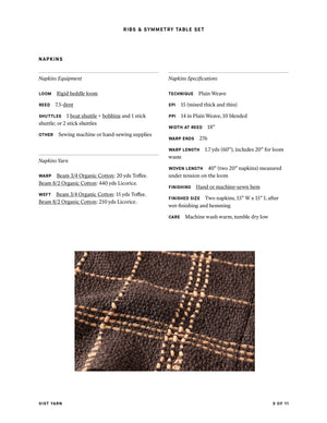 A pattern pair! These two-shuttle Plain Weave projects yield a lovely set of ribbed placemats and charming, square-motif napkins that will add beauty to any table. Inspired by Rep Weave, the placemats use alternating thick and thin wefts and doubled warp threads for a denser sett, but intermittent skipped slots allow the weft to peek through the warp, creating vertical pops of color and borders. Horizontal and vertical stripes of different weight yarns in the napkins enhance the texture, adding a delightful touch. Order a kit.