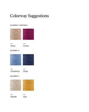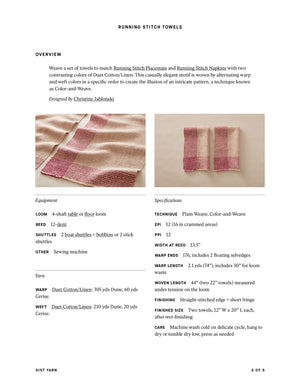 Pattern downloads include files for both rigid heddle and shaft loom weaving. Yardage requirements vary based upon loom waste. Order a kit.