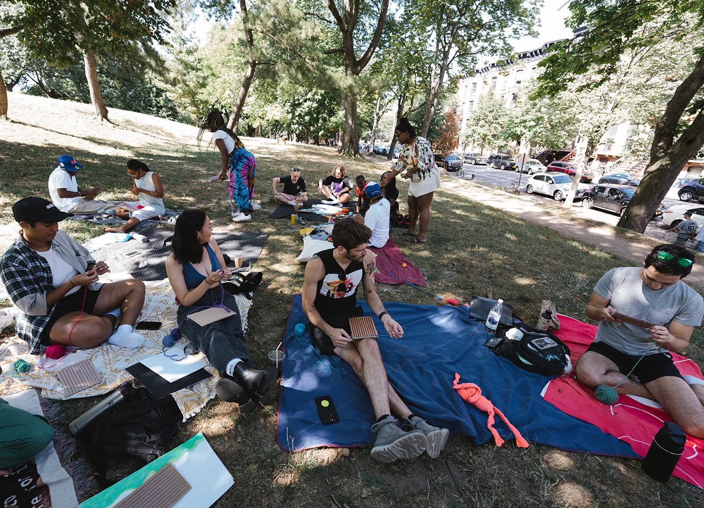 Oftentimes people of marginalized identities are excluded from textile and fiber spaces in NYC. In 2020-2021, I was doing these fiber art surveys based off of the artist Howardena Pindell’s Art World Surveys from the late 1980s. Through these surveys, I found that in NYC’s textile /fiber arts communities, only 1-4% of Black artists are often selected or included for grants + residences in the textile/ fibers arts in NYC. Meaning Black voices are heavily excluded from the textile + fiber opportunities in a “diverse” city like New York City. So for Weaving Skies, this inclusive outdoor activation was a free workshop and open to people to come. During this residency, I was able to collaborate with other artists I’m in community with. Outside Clothes NYC (@outsideclothesnyc) came through. They let folks know about nature events + fun outdoor things to do in NYC and share vignettes of New Yorkers who love to be outside. #dayonesart, who help empower artists + cultural workers through creating pop-ups and collaborations for artists around NYC, helped co-produce this outdoor activation and photography by Mikey Burns (@itsmikeynyc_), a local photographer who's work I truly admire. SO it was really a community affair.