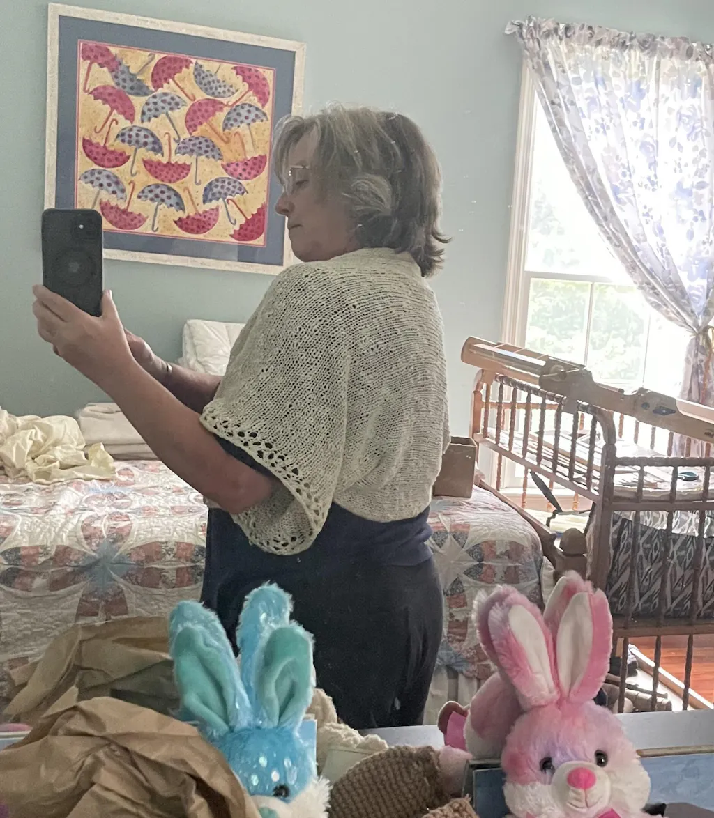 My sister asked me to make her a lightweight, neutral color shrug for SE US climate. I chose Mallo and knitted it up quickly. I’ve never knitted with Mallo before; only used on loom.