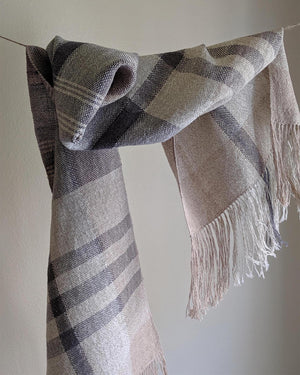 A lightweight scarf in plain weave with spaced warp details. Order a kit.