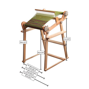Made from Silver Beech hardwood the loom is very strong and robust. The included second heddle harness gives extra versatility to this loom by allowing for weaving with two heddles. Drilled holes on the underside of the loom allow it to be used as a warping board (warping pegs not included but sold with our Deluxe Kit). Comes in 16", 24", 32", and 48" weaving widths, and has 2.5, 5, 7.5, 10, 12.5, and 15 dpi reeds.