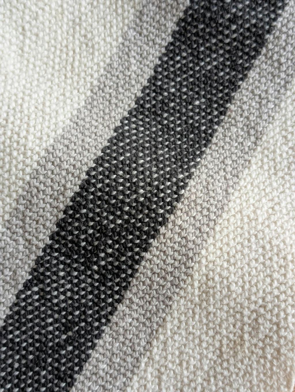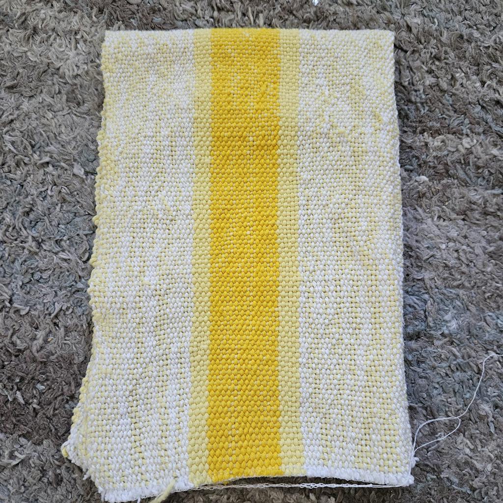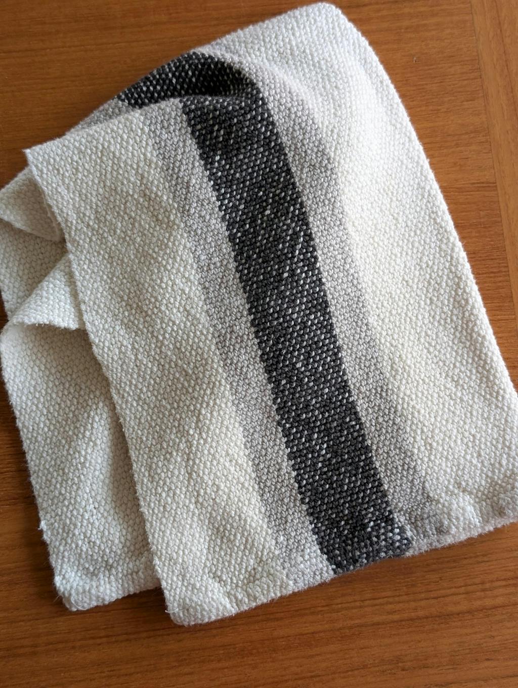 These are my new favorite kitchen towels. As it was my second project I was a little worried by the loose weave when it came off the loom, but after washing and drying they are thick, dense, and soft. They are super absorbent and normal kitchen stains wash out easily. My only tip is to make sure you take the time to pin before hemming by machine, as the unwashed towel fabric likes to slide around under the presser foot.