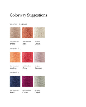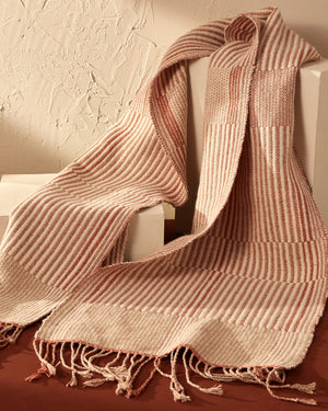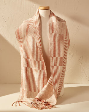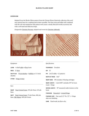 Adapted from the Blocks Pillow pattern from the first Weave Quarterly collection, Chroma, this scarf uses neutral analogous colors for a sophisticated winter wearable. The Duet warp and tabby weft combined with the soft and sumptuous Ode pattern weft create a sturdy, blizzard-worthy accessory, but with a soft hand and delicious drape. Order a kit.