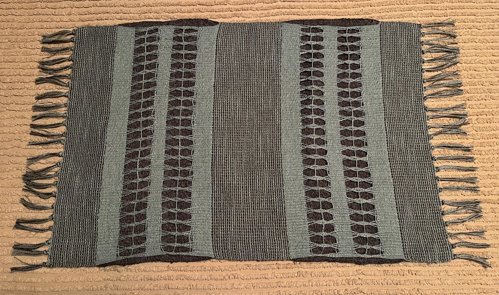 This rug is woven with three different structures: Plain Weave, Doubleweave, and Leno. The Plain Weave sections alternate picks of Duet and Mallo to weave a marled texture, while the Doubleweave sections create two distinct layers—one entirely weft-faced, and another with Leno accents. This piece is intended to be used as a decorative rug on the floor of your home, but can also be placed on a table, or hung on the wall. Order a kit.