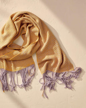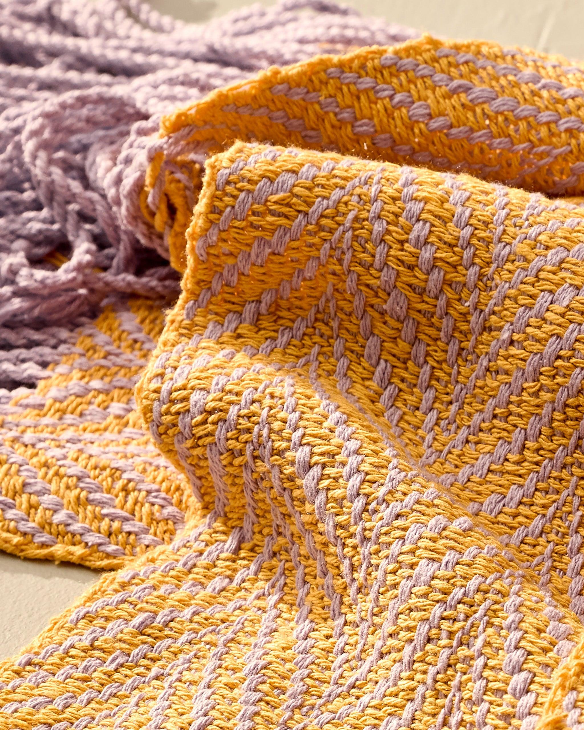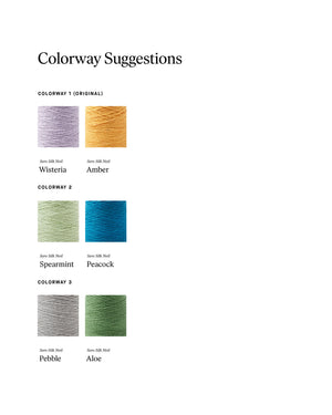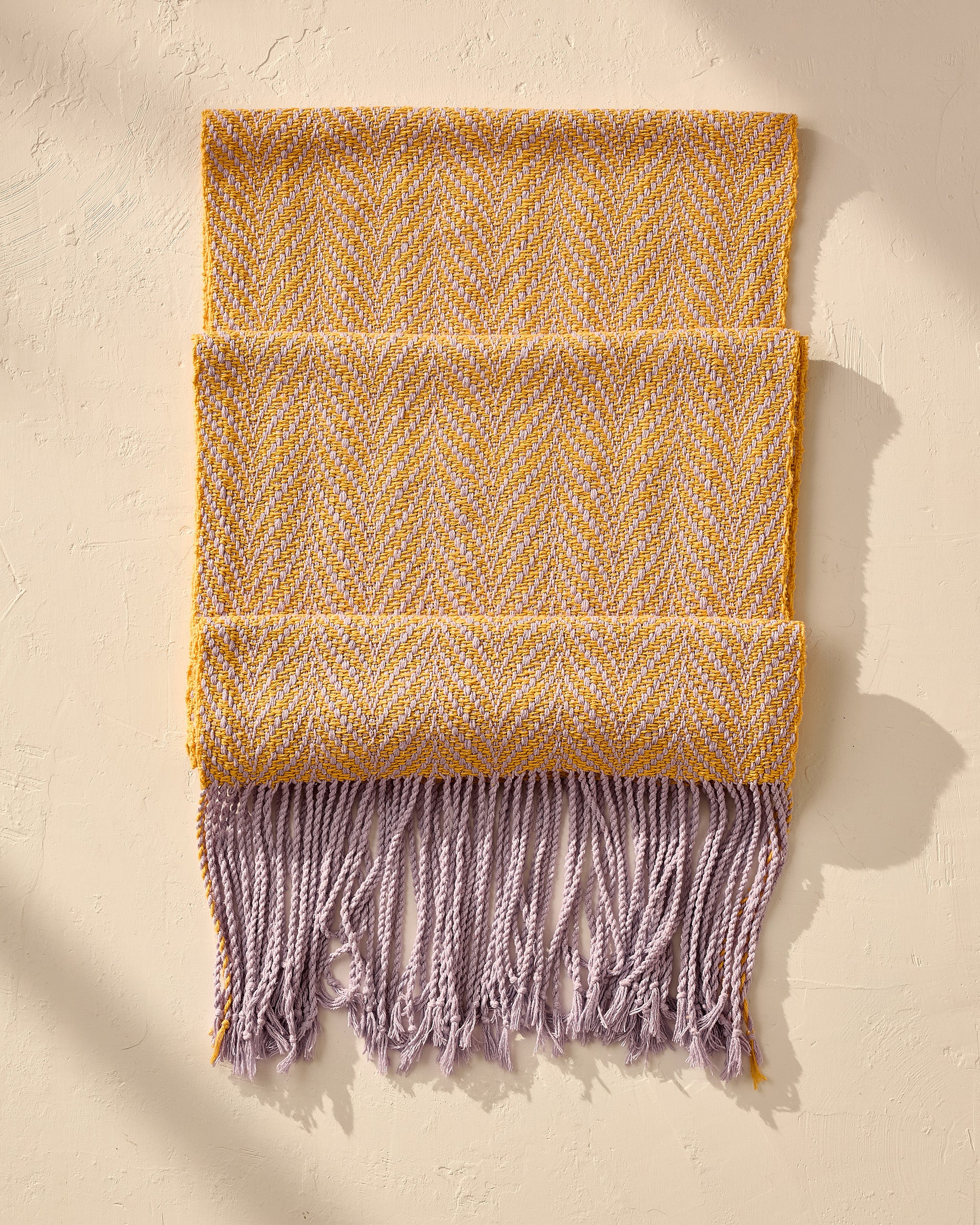 Adapted to two colors from the 2024 Weave Quarterly Land, Sea & Sky collection, this extended point twill and repeated shafts creates undulating curves in this soft and cozy scarf. A variation in the treadling helps create a more stable fabric while also amplifying the curves in the pattern, simulating the movement of the ocean currents. Luminous Sero Silk Noil creates iridescent sparkle throughout the scarf, reminiscent of swimming schools of fish, sunlight reflecting off the surface of the water, or whitecaps of breaking waves. Order a kit.