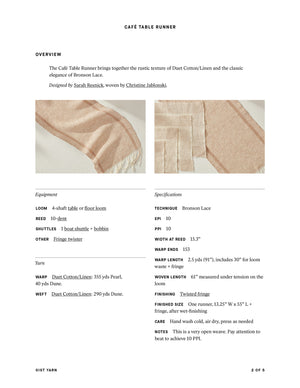 A table runner that brings together the rustic texture of Duet Cotton/Linen and the classic elegance of Bronson Lace. Order a kit.