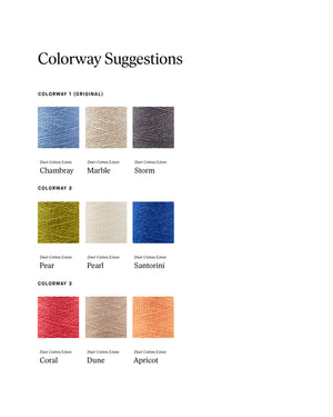 I recently rekindled my love of weaving after years away. I'm so glad this was one of my first projects. I learned a lot in the process of warping with multiple colors and following the delightful pattern in weaving these towels. It was great to have three different towel patterns based on the treadling. I made one set with Duet Chambray and Santorini and Beam in natural and another with Duet Pear, Pearl and Santorini. The photo doesn't do justice to the beautiful Pear color. They wet finished beautifully and were holiday gifts for my nieces. I'll be making another set in Duet Coral, Dune and Apricot for my sister...or maybe myself. Ha! Thanks for your great designers and yarns. Terrific inspiration!