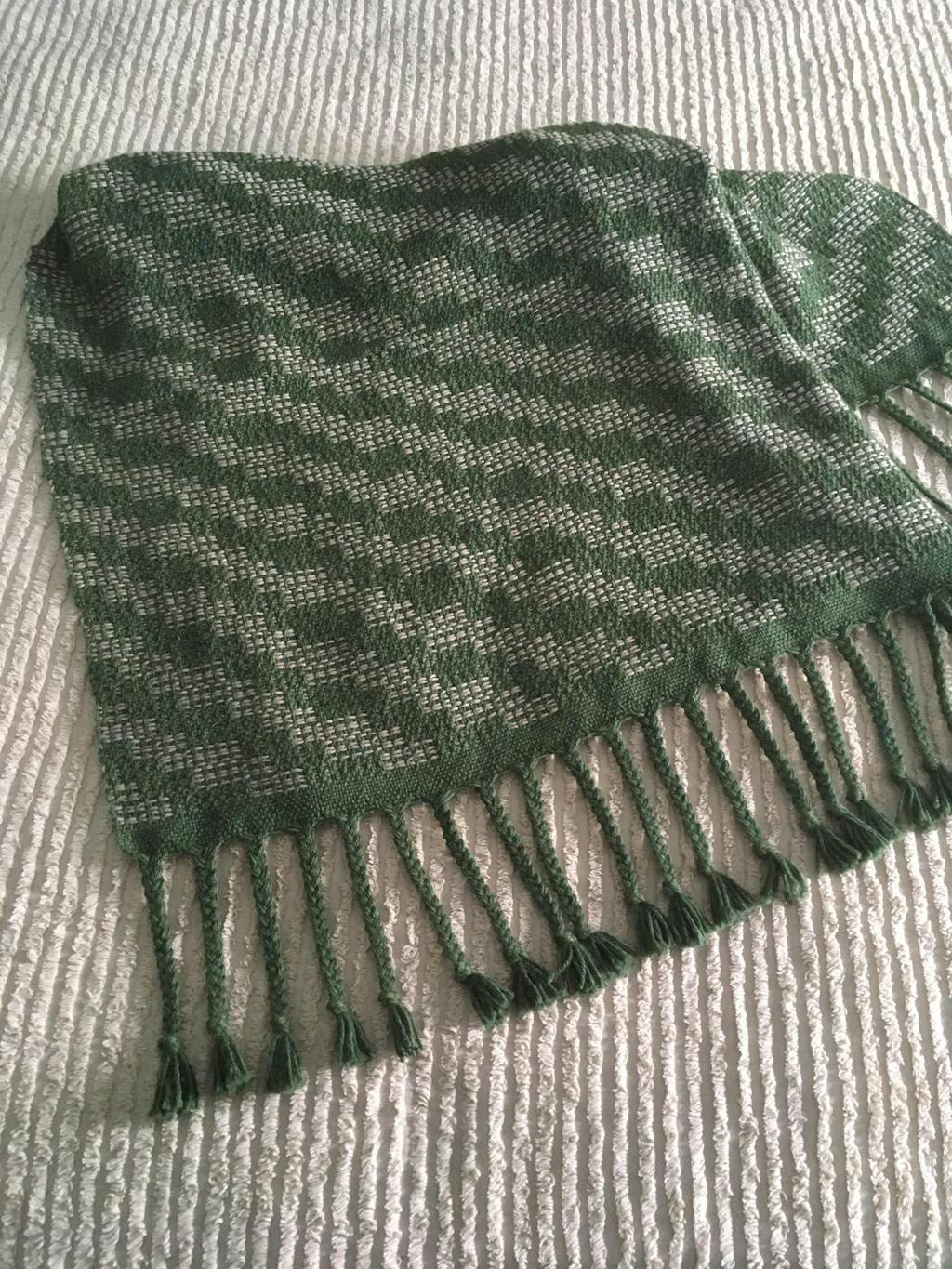 Well written draft produced a gorgeous throw for my sunporch. Despite my initial concerns about broken warp threads with this soft fiber, I never experienced a single one; I did use a temple throughout. 12 PPI and 12 EPI produce a lovely, soft drape. Braided fringe was a nice change from twisted. Finished in a short warm Eucalon bath, rolled in towels to blot, and laid flat to dry. Surprisingly little shrinkage. The Ode alpaca is a dream to work with and produces an heirloom worthy product.