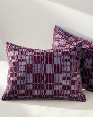 This accent pillow pattern explores the possibilities of Halvdräll (an Overshot variation with small floats) on an 8-shaft loom. The fronts and backs are woven as continuous yardage, and sewn into envelope-style covers with a few simple seams. With a fully reversible block pattern, you can choose either side to use as your pillow front, or sew one of each. Order a kit.