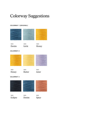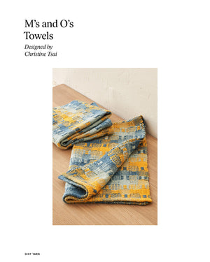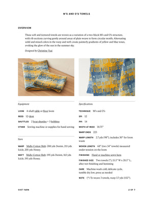 These soft and textured towels are woven in a variation of the two-block M’s and O’s structure, with three-unit rib sections curving gently around areas of plain weave to form circular motifs. Alternating blocks of solid and mixed colors in the warp and weft create painterly gradients of yellow and blue tones, evoking the glow of the sun in the summer sky. Order a kit.
