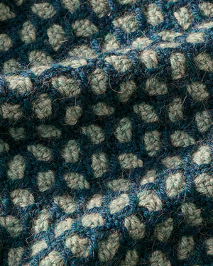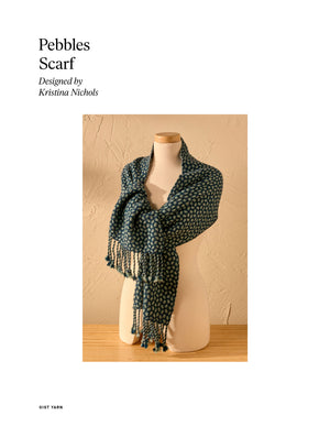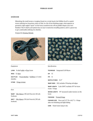 Mimicking the small stones or seaglass found on a rocky beach, the Pebbles Scarf is a quick weave utilizing two luxurious colors of Ode. In a bit of wet-finishing magic, what appears as geometric right angled “spots” on the loom, transform into off-set pebble shapes once wet-finished. This 8-shaft scarf pattern has an easy to memorize treadling pattern, and is a great way to get comfortable utilizing two shuttles.Order a kit.