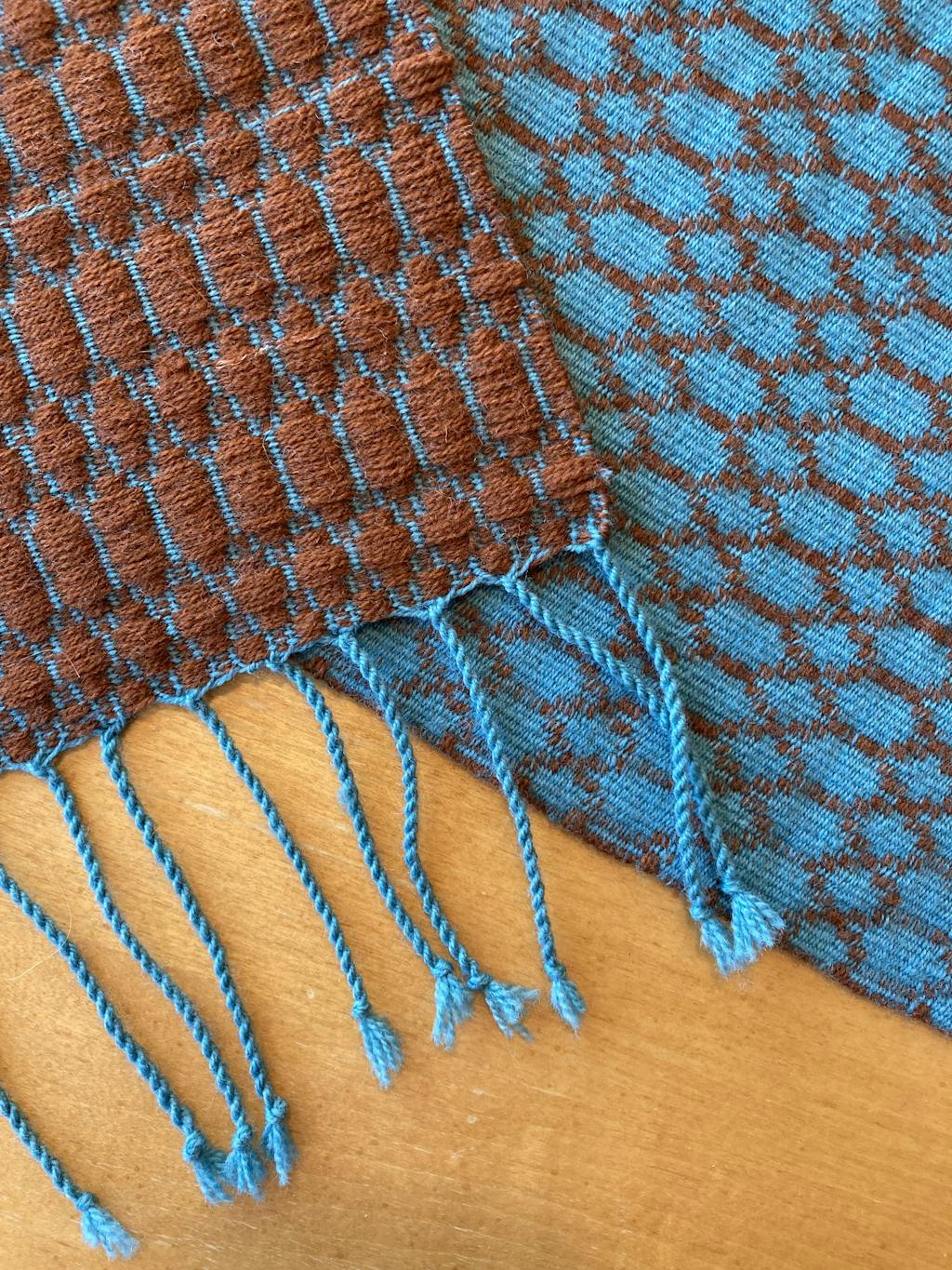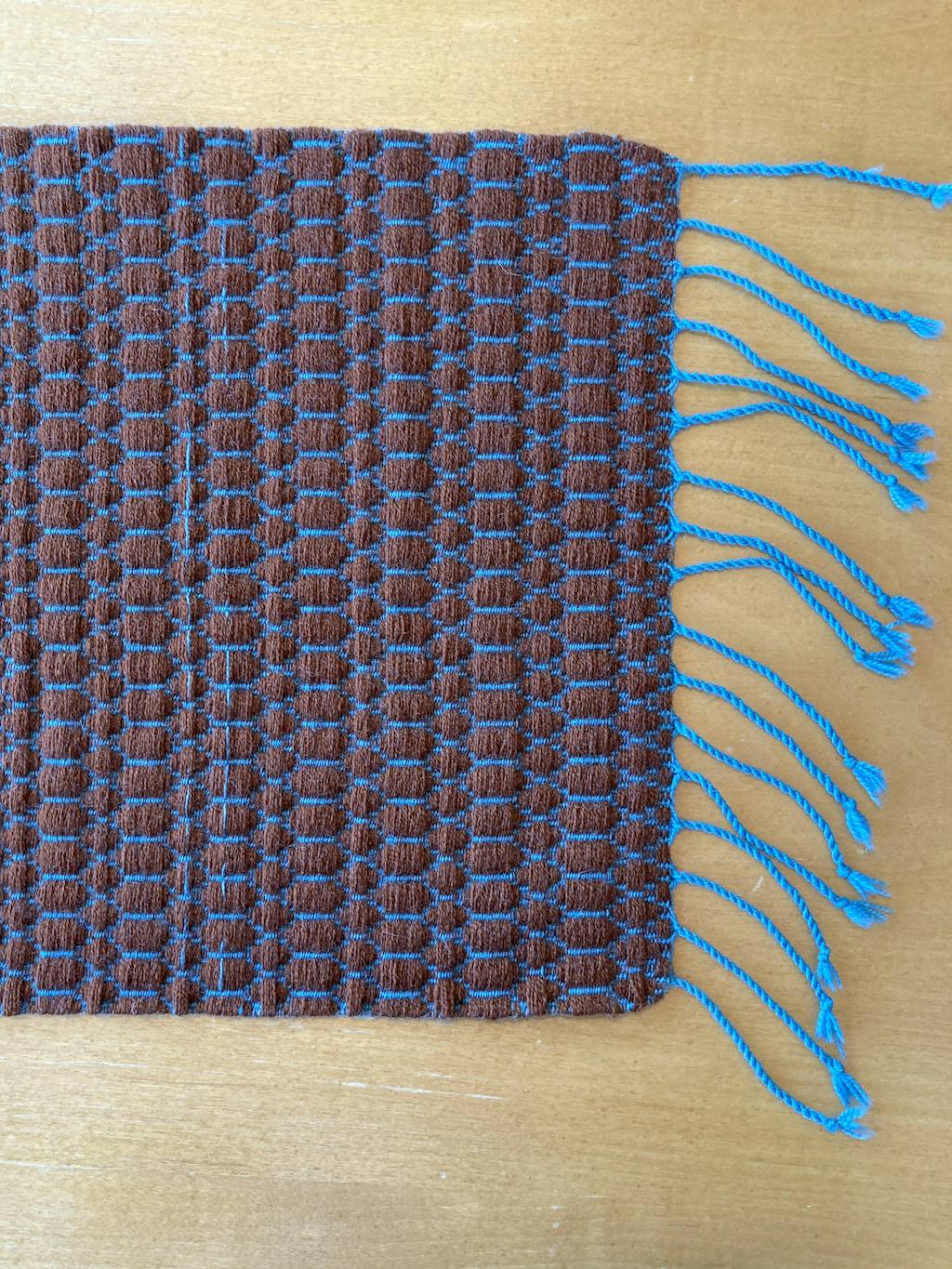 This reversible table runner is inspired by the color and pattern of the poison dart frog. Two contrasting shades of Array Wool are woven in an Overshot variation that is completely weft-faced. The tabby and pattern wefts are so densely packed that the “spots” become three-dimensional. Order a kit.