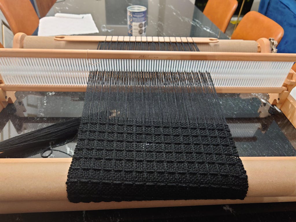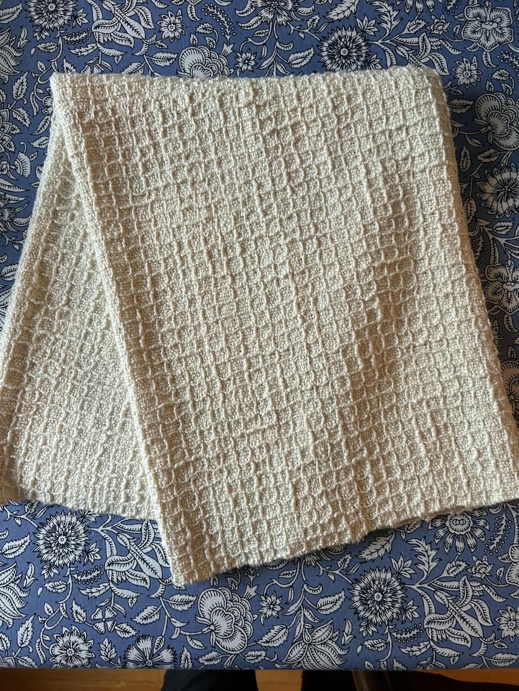 This cotton blanket is woven with a pick-up stick in a Windowpane pattern. The warp and weft floats closely resemble waffle weave. Order a kit.