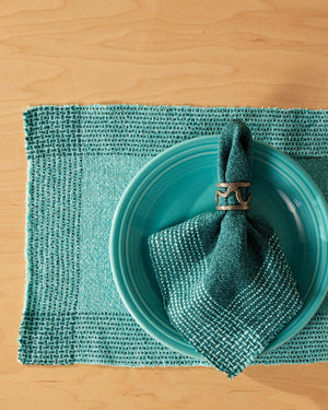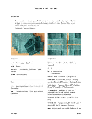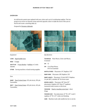 An old favorite pattern gets updated with new colors and a set of coordinating napkins. The two projects are woven on separate warps and with opposite colors to make the most of the yarn in the kit and create a stunning table set.