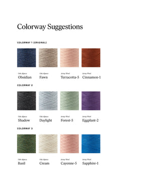 Pattern downloads include files for both rigid heddle and shaft loom weaving. Yardage specifications and dimensions vary based upon the loom and required waste. Order a kit.